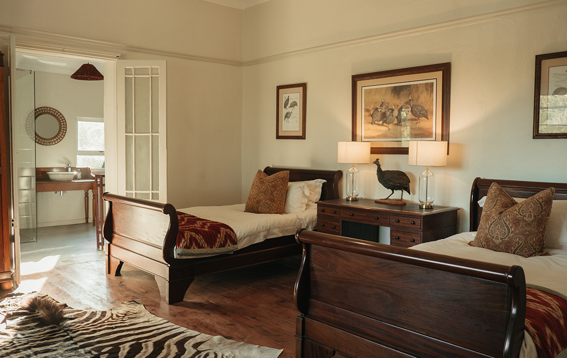 Our trophy lodge is only a 2 min drive from the Lindale Lodge and embodies a unique blend of charm, authenticity, and adventure. It’s filled with vintage hunting memorabilia, antique maps, and taxidermy trophies that lend a sense of nostalgia to the house. A cosy bar and fireplace set the tone for late night sharing stories and camaraderie, the front veranda is also a welcome place for a sundowner after the days pursuits. Although rustic, comfort is still essential. All the rooms have plush linen with feather pillows and are serviced daily.